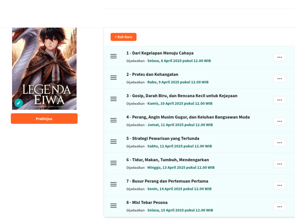 Cerita ini terbit harian pada tengah hari (kecuali penulis kehabisan ide). Dan bisa diakses melalui Wattpad: https://www.wattpad.com/story/392484970-legenda-eiwa-nu